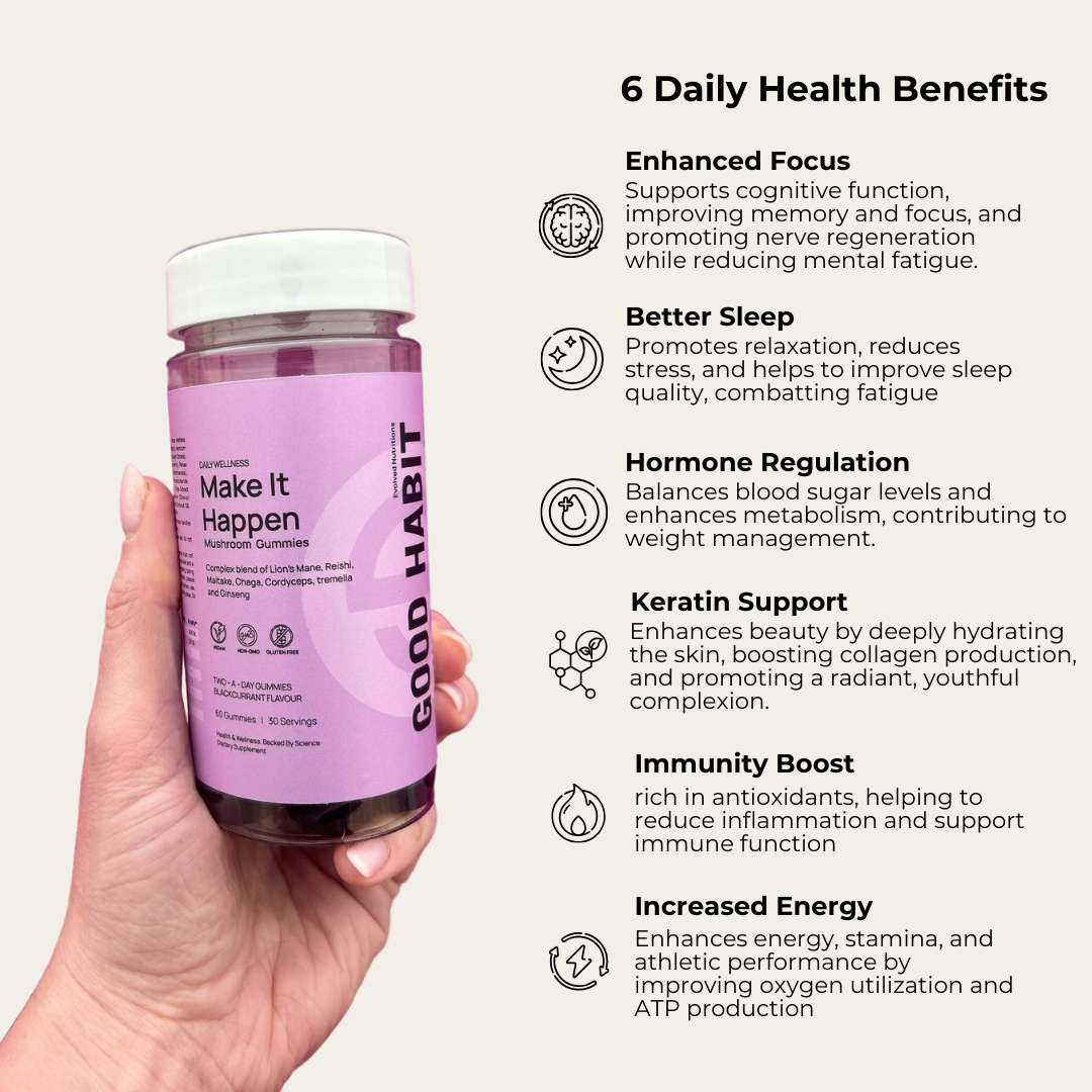 Support your day-to-day wellness with Make It Happen by Evolved Nutritions. These potent blackcurrant-flavoured gummies combine six powerful mushrooms—Maitake, Lion’s Mane, Cordyceps, Tremella, Reishi, and Chaga—alongside ginseng and pantothenic acid for cognitive clarity, energy, immune resilience, skin hydration, and stress adaptation. Ideal for busy lifestyles in need of full-spectrum support.