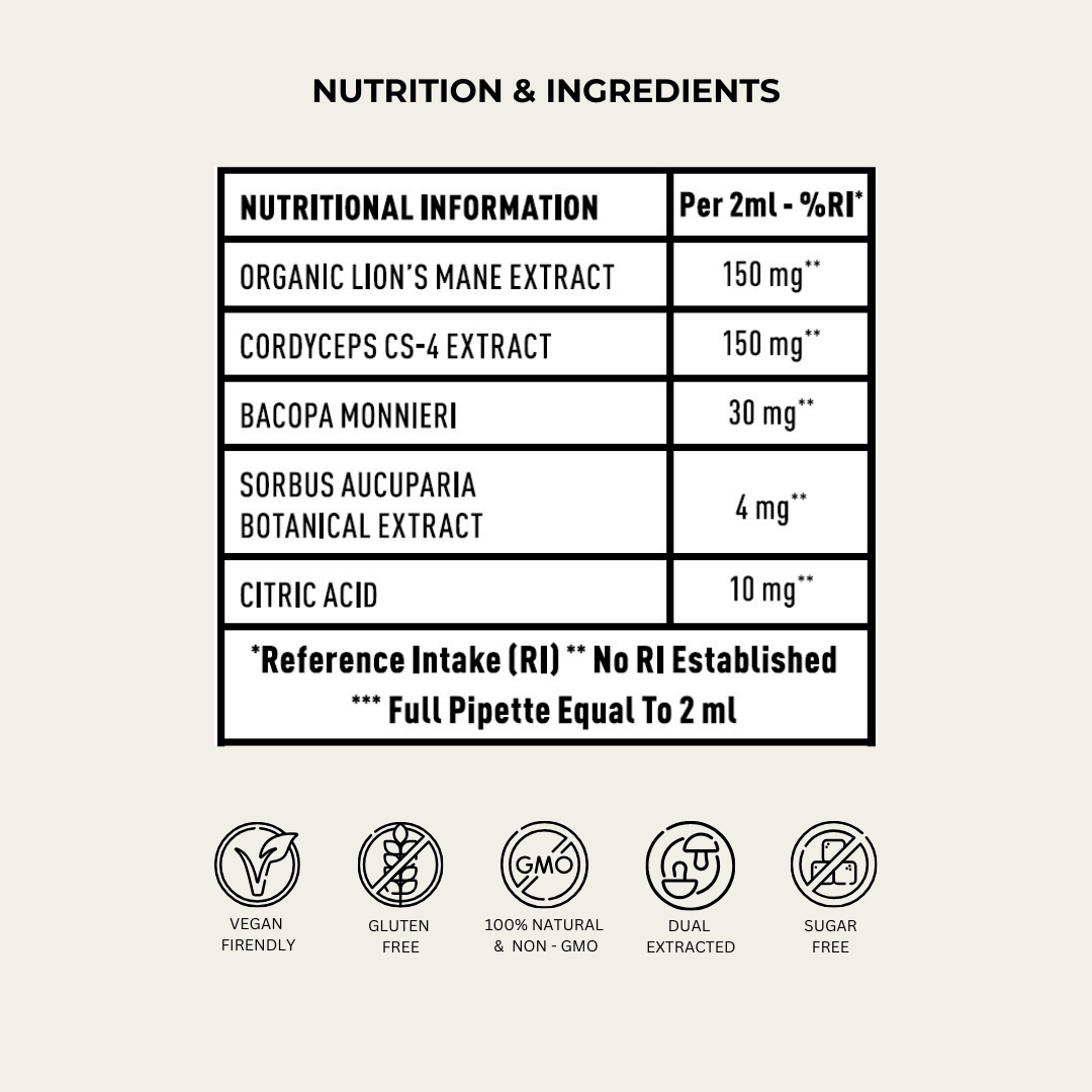 - Organic Lion’s Mane extract (15:1, 4,500 mg polysaccharides)