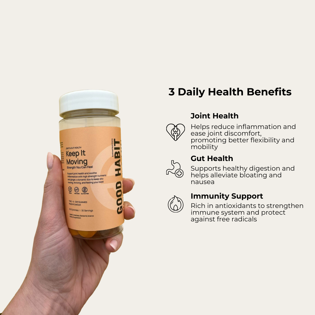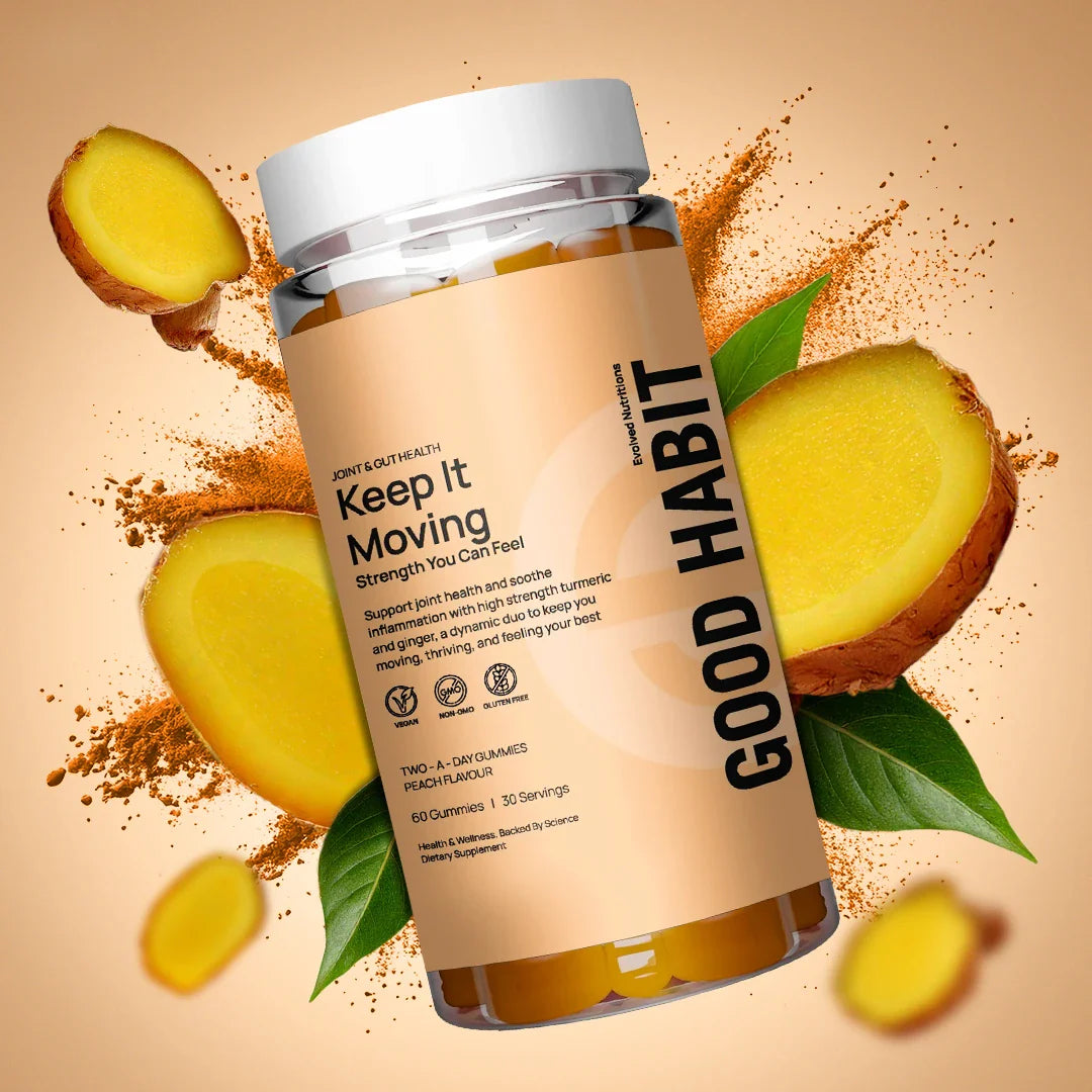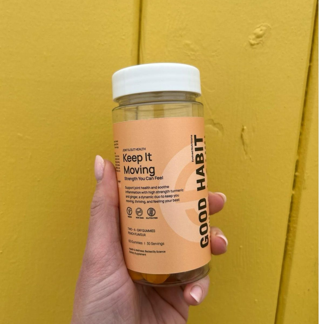 Enhance your daily wellness routine with Keep It Moving by Evolved Nutritions. These peach-flavoured, vegan gummies combine turmeric and ginger extracts—each serving delivering 165 mg turmeric and 25 mg ginger—to support joint mobility, digestion, and natural inflammation response in a delicious, convenient format.